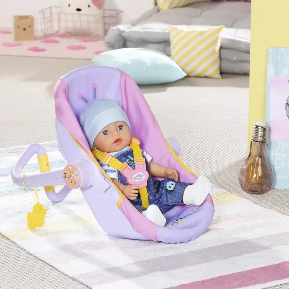 ¡A Los Mas Pequenos Les Encantara Viajar Con Baby Born En Su Sillita Super Divertida! ¡Con Adorables Colores Lila Y Rosa Y Estampado Animal, Puedes Asegurar A Baby Born Con Sus Pequenos Cinturones De Seguridad Y Viajar Con Estilo! El Asa En Forma De Z Tambien Facilita Su Transporte.