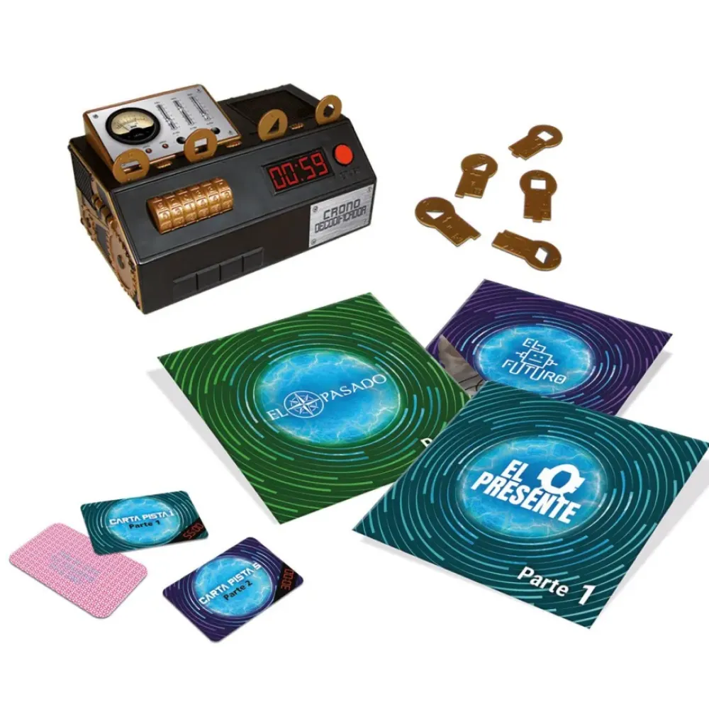 Juego De Mesa Familiar Que Simula Una Experiencia Escape Room De Verdad. Con 3 Aventuras Tematizadas En Los Viajes En El Tiempo: El Pasado, El Presente Y El Futuro. El Objetivo Es Conseguir Resolver Cada Una De Las Aventuras En Menos De 1 Hora A Traves De La Resolucion De Enigmas, Jeroglificos, Adivinanzas, Sudokus, Crucigramas En Familia.