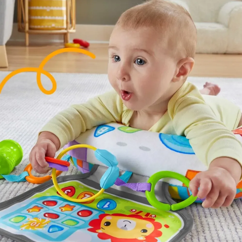 Juega Boca Abajo Con El Cojin Pequeno Gamer De Fisher-Price. Este Suave Cojin Sujeta A Tu Recien Nacido Y Permite Que Este Comodo Mientras Disfruta Jugando Con La Pantalla Para Arrugar, Los Auriculares Que Hacen Ruido Y El Sonajero Con Forma De Bebida Energetica Que Se Enganchan Al Cojin. Tu Pequeno Jugador Puede Fortalecer Sus Habilidades Motrices Gruesas Y Deleitar Sus Sentidos Con Divertidos Sonidos Y Texturas Mientras Esta Boca Abajo.