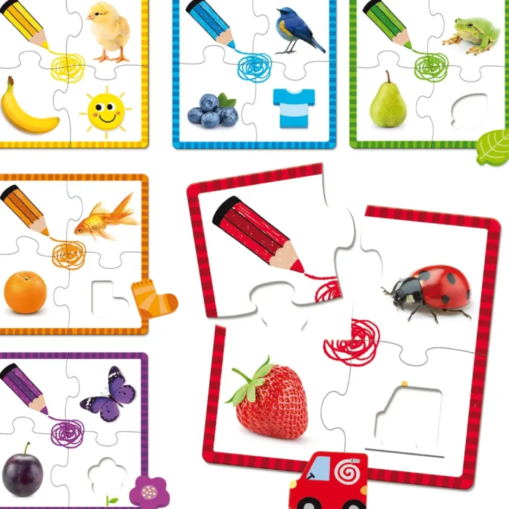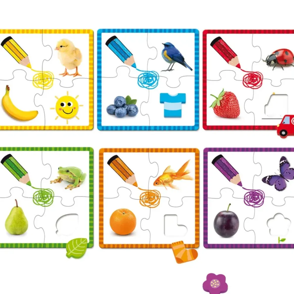 6 Puzles De 4 Piezas Cada Uno Para Aprender Los Colores. Cada Uno De Los Puzles Se Corresponde Con Un Color Distinto Y Tiene Asociadas Imagenes De Ese Color. Una De Las Piezas Del Puzle Esta Compuesta Por Una Pieza De Madera Que Ayudara A Completar El Puzle. El Tamano De Cada Puzle Es De 18X18 Cm.