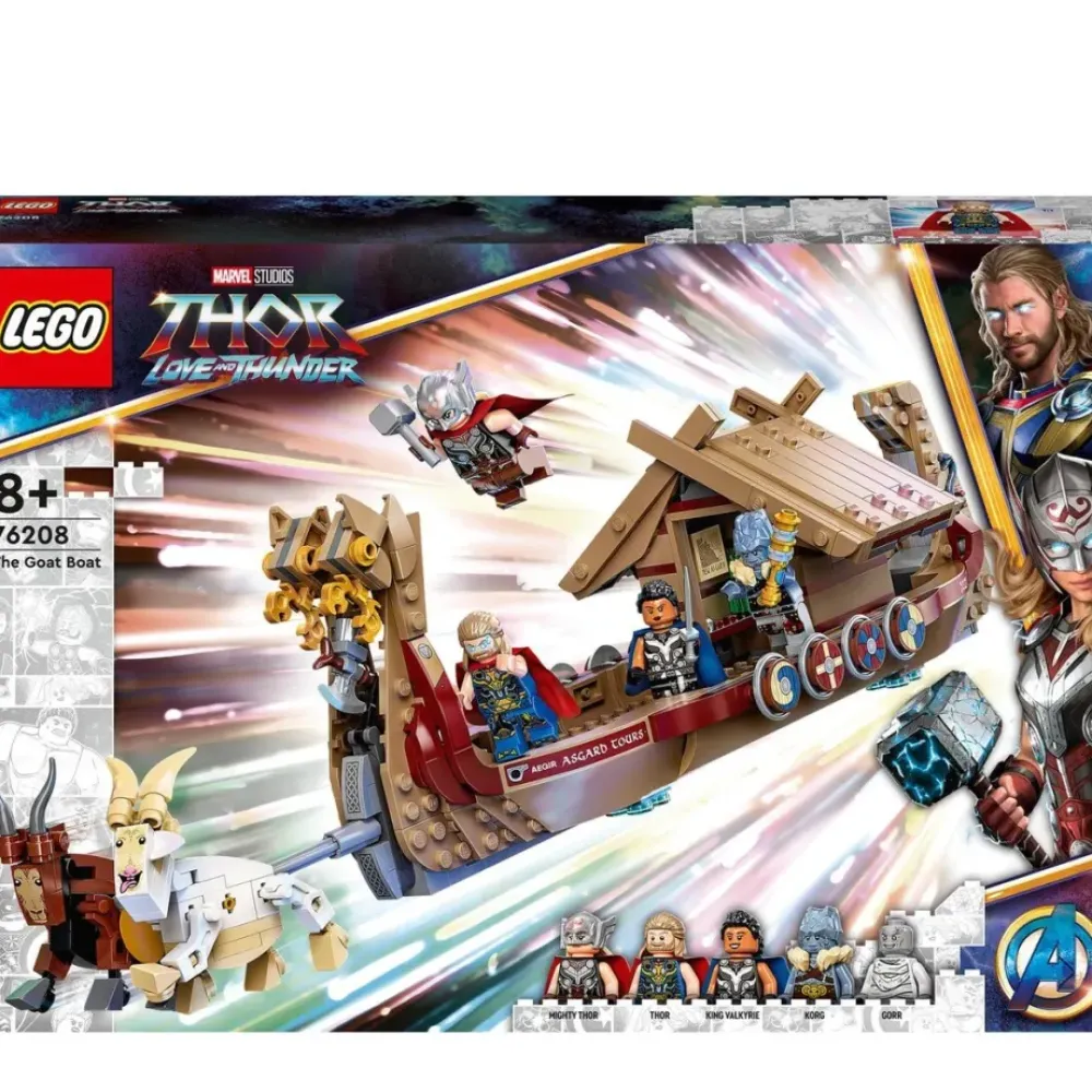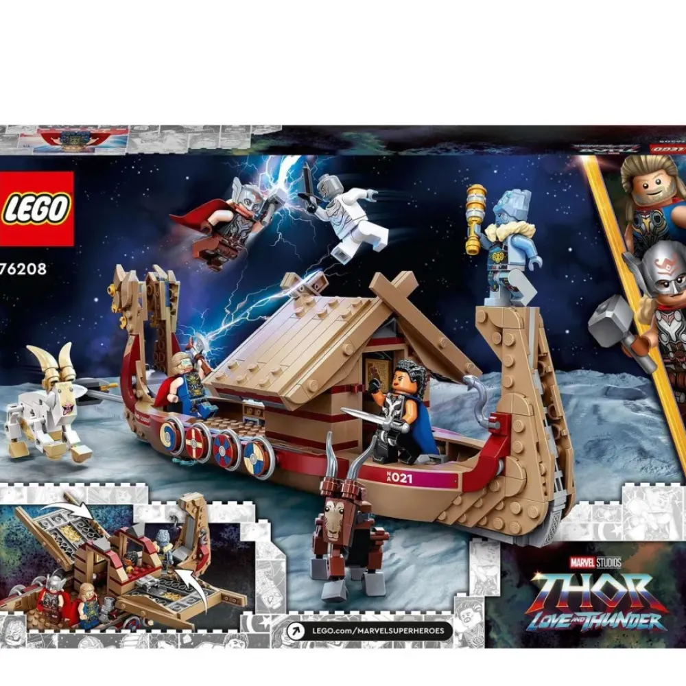Cuando Tu Peque Se Imagine A Bordo Del Imponente Barco Vikingo Volador De Thor, La Accion No Tardara En Llegar. Este Juguete De Construccion Lego Marvel Barco Caprino (76208) Inspirado En La Pelicula Thor: Love And Thunder Tiene Todo Lo Que Los Ninos De 8 Anos En Adelante Necesitan Para Librar Emocionantes Batallas Junto A Su Superheroe Favorito. Este Set Incluye Las 5 Mini Figuras Lego De Thor, El Poderoso Thor, Valkiria, Korg Y Gorr, Ademas De Multiples Accesorios Y Armas, Como La Famosa Hacha Destructor De Tormentas »Stormbreaker» De Thor.
