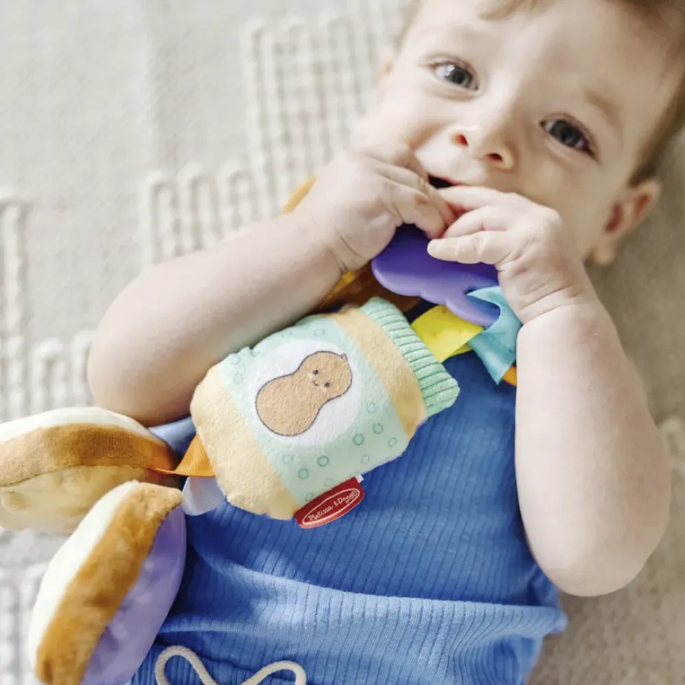 Este Adorable Juguete Con Clip Es Una Forma Deliciosa De Entretener A Los Bebes Mientras Estimula Sus Sentidos. Dos Rebanadas De Pan De Felpa Presentan Mantequilla De Cacahuete De Pana En Una Y Gelatina Satinada En La Otra Para Deleitar El Sentido Del Tacto Del Bebe. El Tarro De Doble Cara, Suave Y Sonajero, Es Facil De Agarrar, Y Los Firmes Trozos De Plastico De Cacahuete Y Uva Tienen Una Textura Que Tienta A Los Deditos A Tocar. Lleva La Diversion Dondequiera Que Vaya El Bebe: Engancha Facilmente El Juguete De Seis Piezas Y Multiples Texturas A La Silla De Paseo, El Asiento Del Coche, La Bolsa De Los Panales O La Trona Para Tenerlo Siempre A Mano. Los Juguetes Melissa & Doug Para Bebes Y Ninos Pequenos Inspiran Momentos De Descubrimiento. Adorables Y Diversos Personajes Y Una Variedad De Divertidas Formas Y Texturas Fomentar La Exploracion, El Juego De Desarrollo De Habilidades.