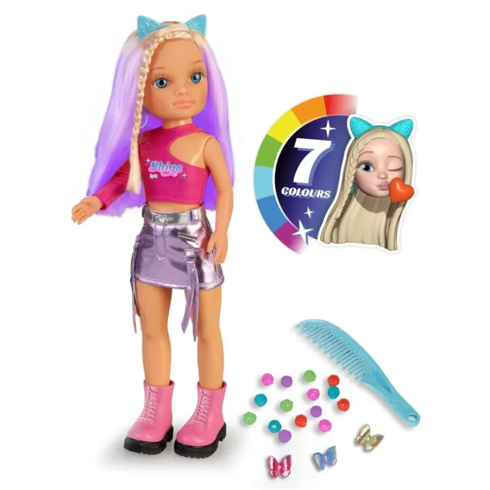 Con Nancy Hair Colour Change Podras Cambiar El Color Del Pelo De Nancy Con Solo Presionar Un Boton, En Hasta Siete Tonalidades Diferentes ¡El Efecto Es Magico! Para Hacer La Experiencia Colour Change Todavia Mas Alucinante Incluye Un Monton De Accesorios Para El Pelo,Para Hacer Diferentes Looks A Nancy Que Combinen Con El Color De Su Pelo: Pinzas En Forma De Mariposa, Bolitas De Colores Para Decorar Mechones De Pelo, Una Diadema Con Orejitas Y Un Peine Para Peinar Su Larga Y Rubia Melena. Nancy Esta A La Ultima Con Su Minifalda Efecto Cuero En Color Morado, Camiseta Fucsia Asimetrica Y Botas Militares.