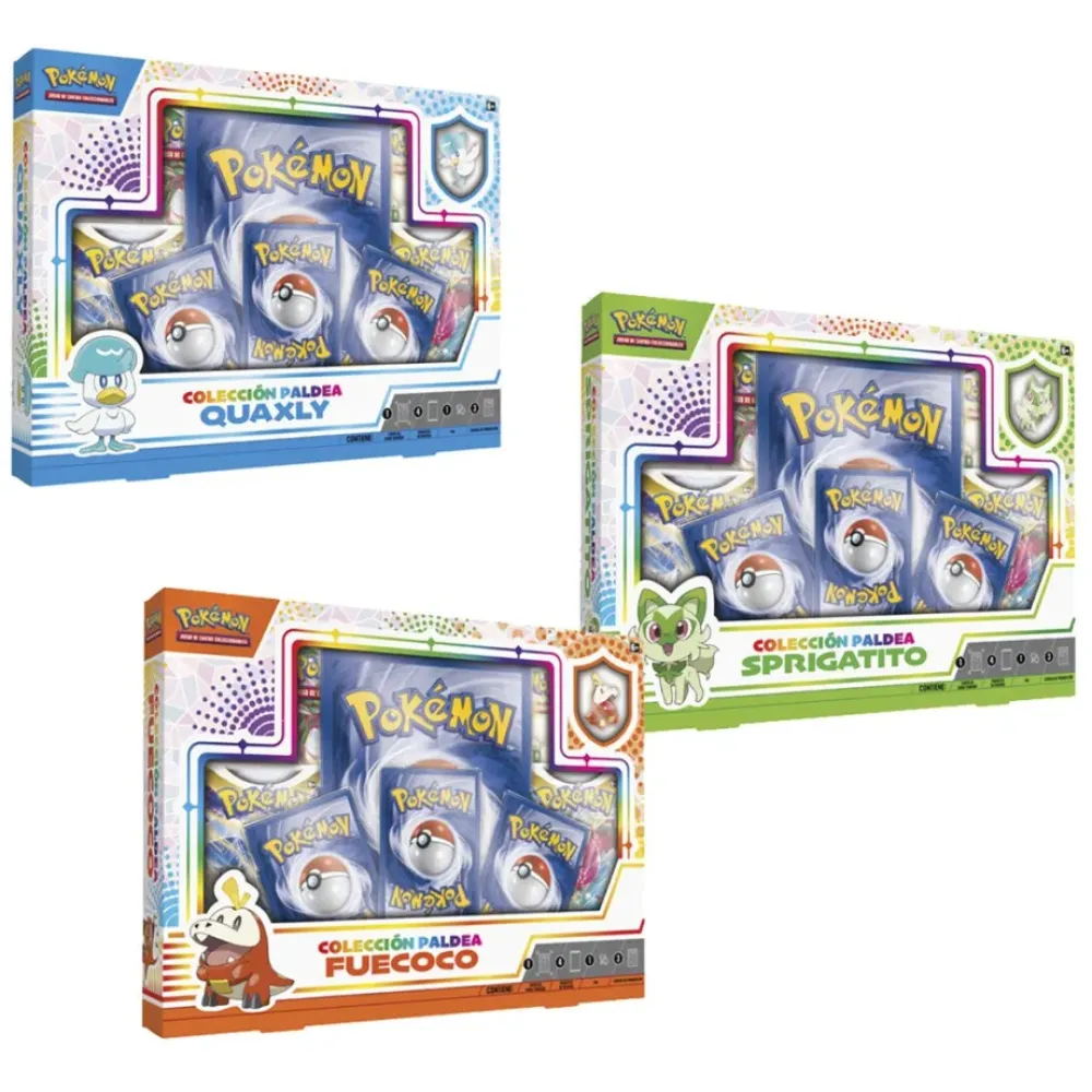 Coleccion Con Pin De Paldea Que Contiene 4 Sobres Del Jcc Pokemon Y Un Pin De Uno De Los Pokemon Iniciales En Paldea.
