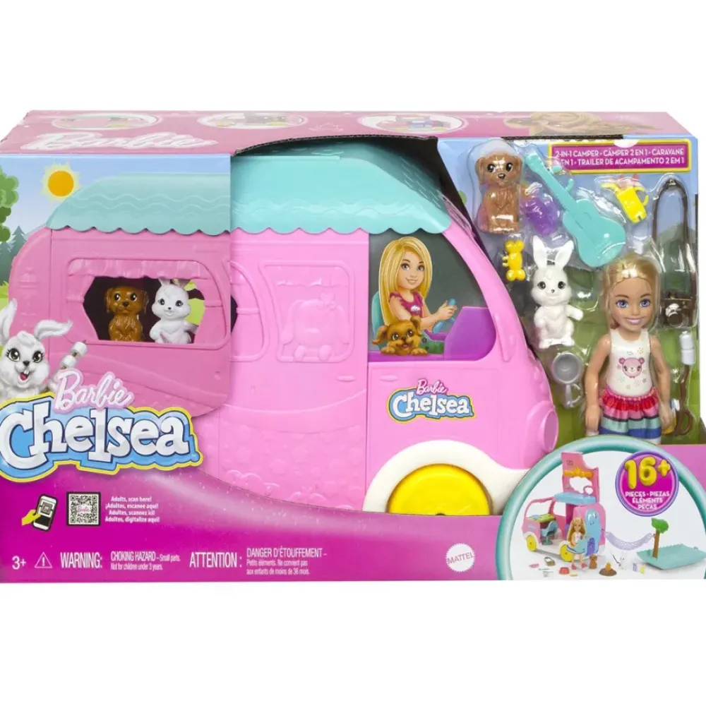 Deja Volar Tu Imaginacion Con La Muneca Chelsea Y Sus Dos Mascotas Con El Conjunto De Autocaravana 2 En 1 De Barbie Chelsea. El Vehiculo Transformable Se Abre Para Revelar Seis Areas De Juego, Entre Las Que Se Incluye Una Cocina. Da La Vuelta Al Salpicadero Para Convertirlo En Un Comedor Y Levanta El Tejado Para Convertirlo En Un Dormitorio Con Camas Para La Muneca Chelsea Y Sus Dos Mascotas, ¡Todo Incluido! Los Ninos Y Ninas Tambien Pueden Dar La Vuelta Al Tejado Y Llenarlo De Agua Para Sumergirse En Una Piscina Llena De Historias. Otras 14 Piezas, Como Un Arbol, Una Hamaca Y Muchas Mas, Inspiraran Todo Tipo De Historias Junto A La Hoguera. Esta Versatil Y Divertida Autocaravana Es Un Gran Regalo Para Ninos Y Ninas A Partir De 3 Anos, Especialmente Para Los Amantes De La Aventura Y Las Actividades Al Aire Libre. La Muneca No Puede Tenerse En Pie Por Si Sola. Los Colores Y La Decoracion Pueden Variar.