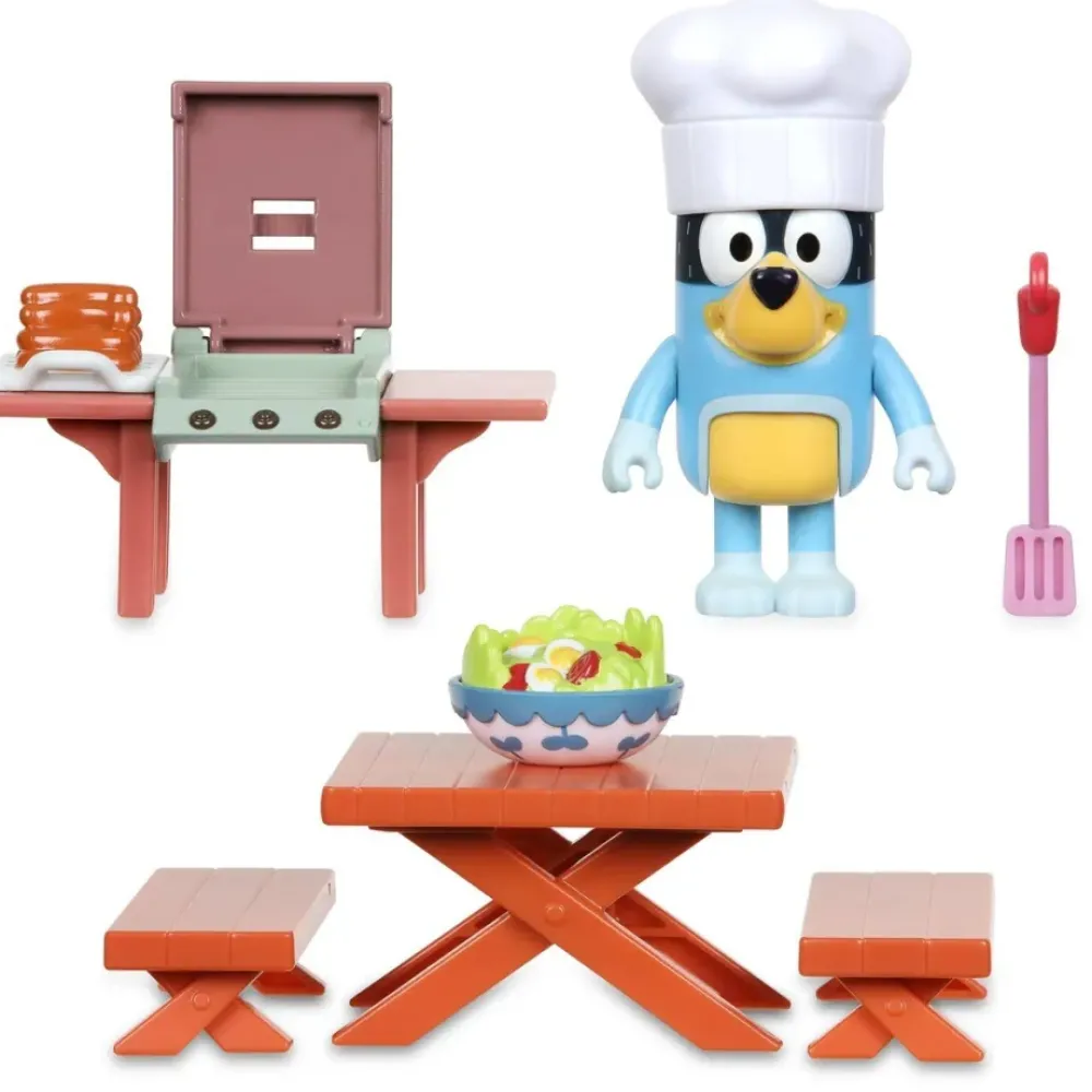 El Mini Playset Del Parque De Juegos Del Recreo Viene Con 3 Accesorios Super Divertidos Y Una Figura De Bluey. Y El Mini Playset De La Barbcoa Viene Con Una Mesa, Barbacoa, La Figura De Bandit -El Papa De Bluey- Y Un Monton De Accesorios Para Cocinar.