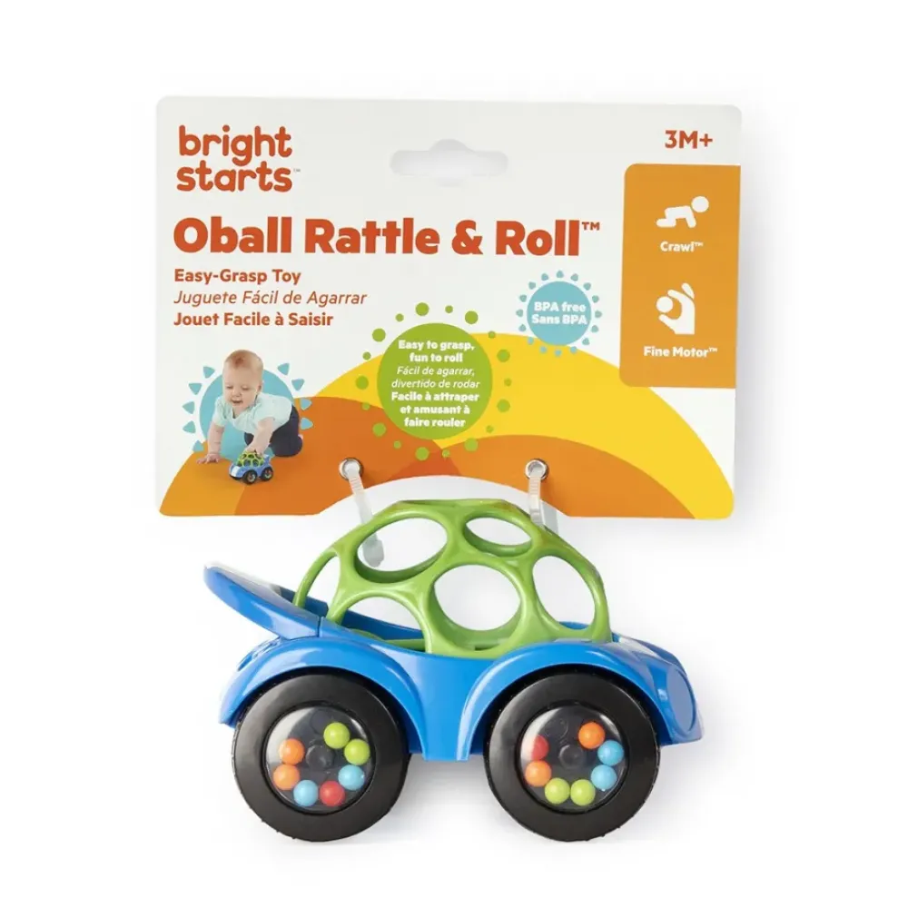 ¡Bebes, Enciendan Los Motores! ¡La Eleccion Perfecta Para El Primer Auto Del Bebe! El Coche De Juguete Rattle & Roll De Oball Utiliza La Fuerza Del Bebe Para Desplazarse Por El Suelo Durante La Hora De Jugar. El Material Suave Y Flexible De Oball Presenta Amplios Orificios Para Introducir Los Dedos, Lo Que Hace Que Sea Muy Sencillo Para El Bebe Agarrarlo Y Rodarlo. Las Coloridas Cuentas Que Resuenan Y Giran Dentro De Las Ruedas Producen Efectos De Sonido Y Estimulo Visual Para Encantar A Los Pequenos Conforme El Automovil Se Mueve Y Rueda. Estos Automoviles De Juguete Seran Un Favorito Del Bebe Mientras Este Crece Ya Que Cuentan Con Superficies Faciles De Agarrar Y Que Puede Morder Asi Como Con Divertidos Sonidos De Sonajero. El Bebe Tomara El Control De La Hora De Jugar Con Este Divertido Y Dinamico Juguete.