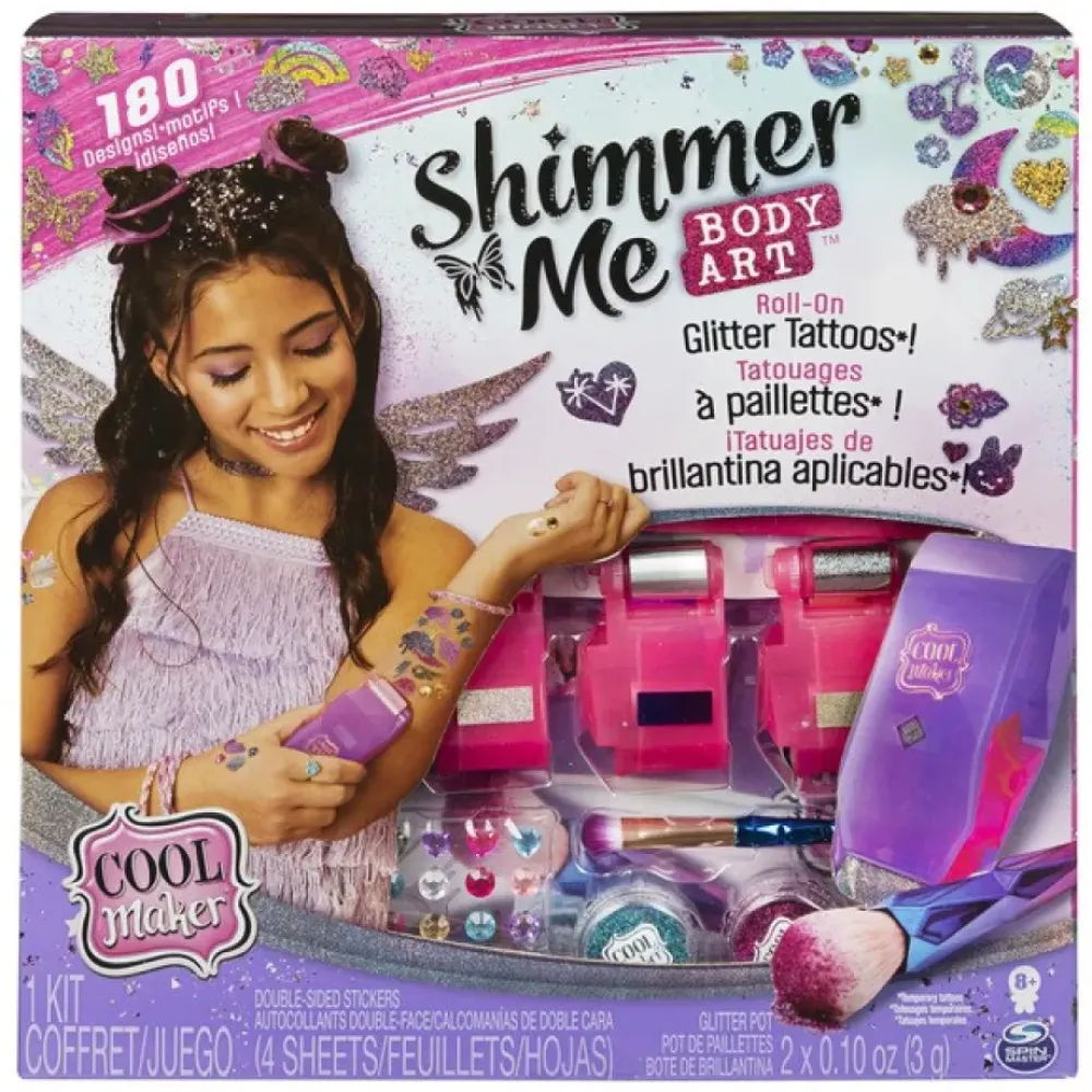 Expresa Tu Estilo Y Crea Tus Propios Tatuajes De Brillantina Con Cool Maker Shimmer Me Body Art. Este Set De Tatuajes Temporales Todo En Uno Para Ninas Tiene Todo Lo Que Necesitas Para Personalizar Tu Propio Tatuaje: Cuatro Cartuchos De Pelicula Metalizada, Dos Colores De Brillantina, Una Brocha Para Brillantina, Gemas, Un Rodillo Y 180 Disenos De Calcomanias De Doble Cara. Hay Tantos Disenos Modernos Y Bonitos Que Puedes Mezclarlos Y Combinarlos Para Crear El Tatuaje Que Mas Te Guste. Es Muy Facil Crear Tus Looks Glamorosos. Limpia La Zona Donde Quieres Aplicar Tu Diseno Y Luego Coloca Una De Las Coloridas Peliculas En El Rodillo. Selecciona Las Calcomanias Para Crear Tu Diseno Personalizado. Manten Presionada Cada Calcomania Sobre La Piel Y Despega La Capa Superior Transparente; Quedara Una Superficie Pegajosa A La Que Se Adhiere La Pelicula. Luego, Mueve Lentamente El Rodillo Sobre Tus Calcomanias Para Revelar Tu Diseno Personalizado. Decora Con Las Gemas, Escoge Un Nuevo Diseno Y Crea Estilos Aun Mas Brillantes. Incluso Puedes Personalizar Los Tatuajes Con El Pincel Para Aplicar Brillantina Directamente En Las Calcomanias O Combinar El Efecto Metalico Con Brillantina Para Obtener Un Estilo Unico. Cada Cartucho De Shimmer Me Body Art Tiene 106,7 Cm De Peliculas Metalicas, Para Que Puedas Disenar, Rodar Y Revelar Una Y Otra Vez. Los Tatuajes Temporales De Shimmer Me Body Art Para Ninas Duran Aproximadamente 24 Horas, Y Los Disenos Y Las Calcomanias Aptas Para La Piel Se Quitan Facilmente Con Agua Tibia Y Un Pano. Este Divertido Kit De Tatuajes De Brillantina Es Un Gran Regalo Para Las Ninas Y Es La Actividad Perfecta Para Fiestas De Pijama, Fiestas De Spa, Cumpleanos Y Mas. Para Obtener Mas Formas De Personalizar Tu Estilo, Consigue El Paquete De Recarga De Shimmer Me Body Art Y Crea Una Manicura Personalizada Con El Go Glam U-Nique Nail Salon (Se Venden Por Separado). Luce Tus Propios Y Hermosos Estilos Con Brillantina Gracias A Cool Maker Shimmer Me Body Art.