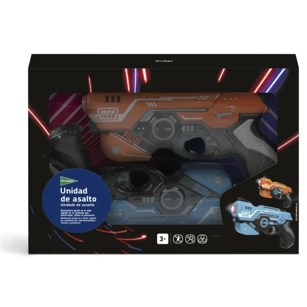 Las Pistolas De Infrarrojos Unidad De Asalto Estan Indicadas Para Ninos A Partir De 3 Anos. Un Combate Cuerpo A Cuerpo Totalmente Inofensivo En El Que Ganara El Mas Rapido. Los Peques Tendran Que Demostrar Su Habilidad Y Ponerse A Cubierto Del Fuego Enemigo. Para Hacer Blanco, Basta Con Disparar A La Pistola Del Rival. Cuando El Arma Reciba 5 Disparos, El Jugador Quedara Eliminado. Las Pistolas Tienen Luz, Sonido De 4 Tipos De Disparos A Elegir Y Vibracion. Se Puede Jugar En Interior O Exterior Y Entre Dos O Mas Jugadores Con Las Mismas Pistolas. Alcance 10-12 Metros. Las Pistolas Funcionan Con 3 Pilas Aa Cada Una (No Incluidas). Medidas De Cada Pistola: 24 X 17 X 3 Cm.