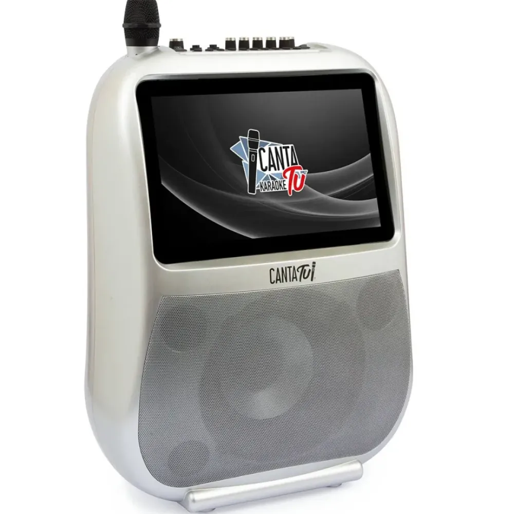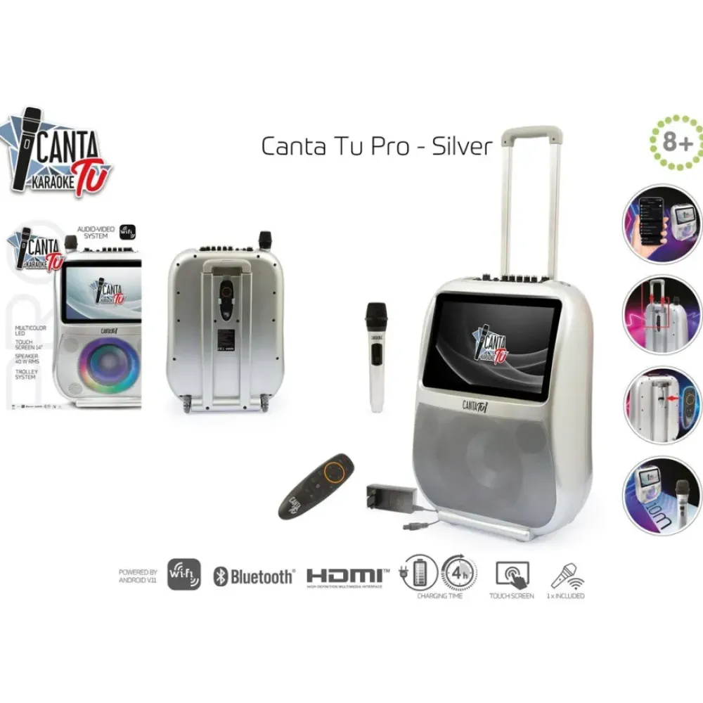 Canta Tu Es Un Sistema De Audio Y Video Completo De Alta Calidad, Que, Gracias A Sus Ruedas Y Mango Telescopico, Se Puede Transportar Facilmente A Cualquier Lugar, Para Animar Fiestas En Familia O Con Amigos, Al Aire Libre O En Interior. Se Conecta Mediante Wi-Fi Con Un Sistema Operativo Android Integrado, Y Tiene Una Pantalla Tactil Que Permite Un Uso Intuitivo E Inmediato De Los Controles. Ademas, Incluye Un Puerto Usb Y Una Memoria Interna Para Poder Conectar Tu Propia Musica. Tiene Un Juegos De Luces Con Efecto Multicolor Que Siguen El Ritmo De La Musica.