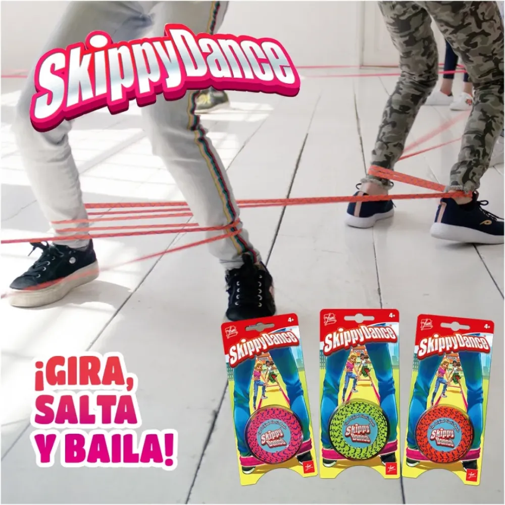 ¡Gira! ¡Salta! ¡Baila! Skippydance Es El Juego De La Goma De Toda La Vida… ¡Ahora Mucho Mas Divertido! Estira La Goma, Sujetala Entre Dos Amigos Y ¡Atrevete Con Los Movimientos Y Pasos Al Ritmo De Tu Musica Preferida! Inventa Tus Propios Bailes Y Compartelos En Tiktok E Instagram Para Hacer Tus Coreografias Skippy Dance Virales. Y Aprende Nuevos Pasos En La Skippy Dance Academy De Youtube. ¡Hay Un Monton De Tutoriales! Reta A Tus Amigos A Hacer Los Pasos Mas Dificiles. Llevatelo Donde Quieras Y Veras Como Todo El Mundo Se Apunta A Bailar. Y Si No Se Unen No Te Preocupes, Porque Te Contamos Un Truco Para Jugar Tu Solo: Coge 2 Sillas Y Pon Una A Cada Lado. Ahora Sujeta La Goma A Las Patas De Cada Silla, Como Si Fueran Las Piernas De Tus Amigos Y ¡Ya Puedes Empezar A Saltar!