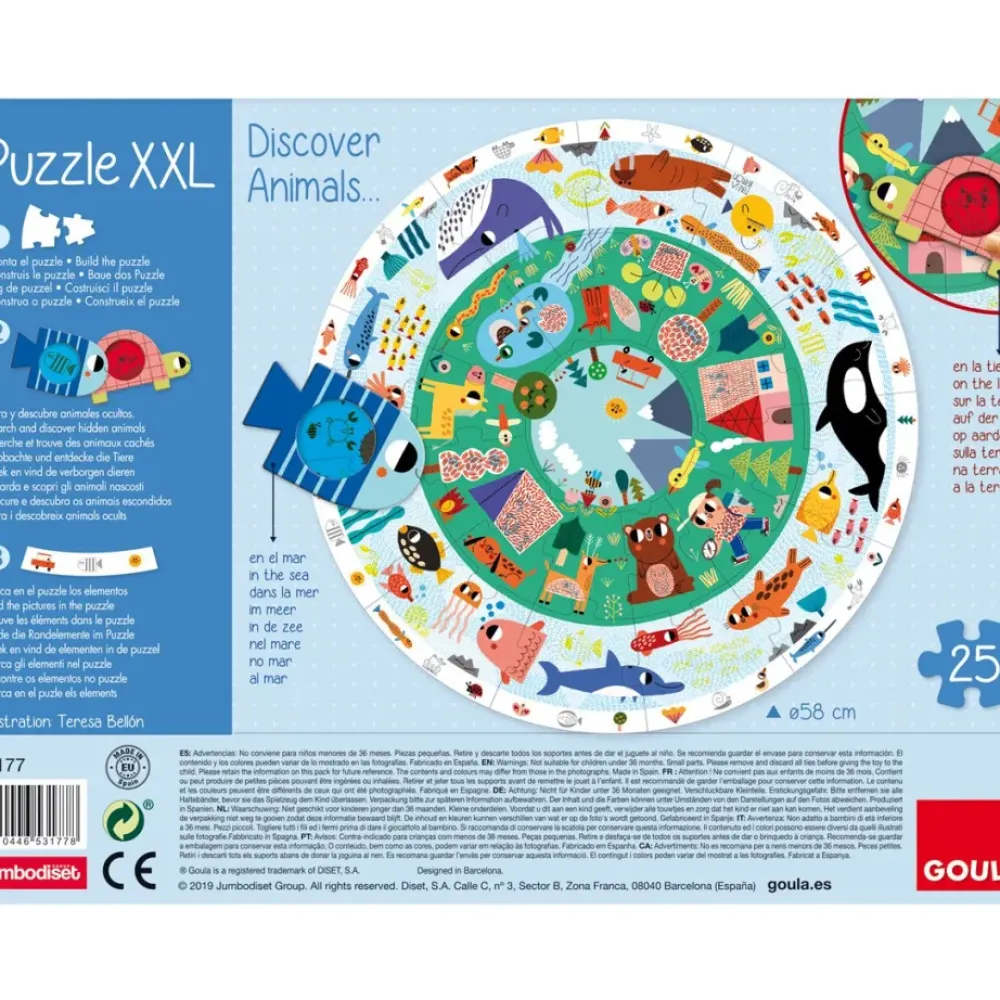 Puzzle De 25 Piezas Grandes Con Ilustraciones De Animalitos Que Se Encuentran En La Tierra Y En El Mar. En El Puzzle Hay Elementos Escondidos Y Se Incluyen Dos Lentes Opticas Para Que El Nino Pueda Descubrirlos