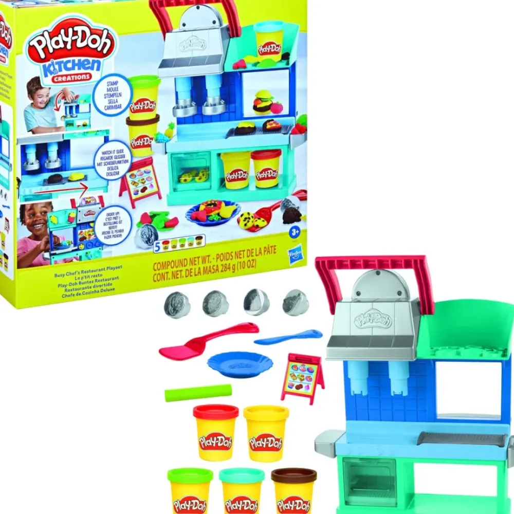 Las Creaciones Mas Coloridas Se Sirven En El Nuevo Restaurante Divertido De Play-Doh . ¡Los Ninos Podran Crear Sus Comidas Favoritas Como Hamburguesas, Pizza, Patatas Fritas Y Muchas Mas! «Ding» Cuando Esten Listas, Pueden Hacer Sonar La Campana Y Mostrarlas En El Expositor Del Chef. Incluye 15 Accesorios Y 16 Botes De Plastilina Play-Doh.