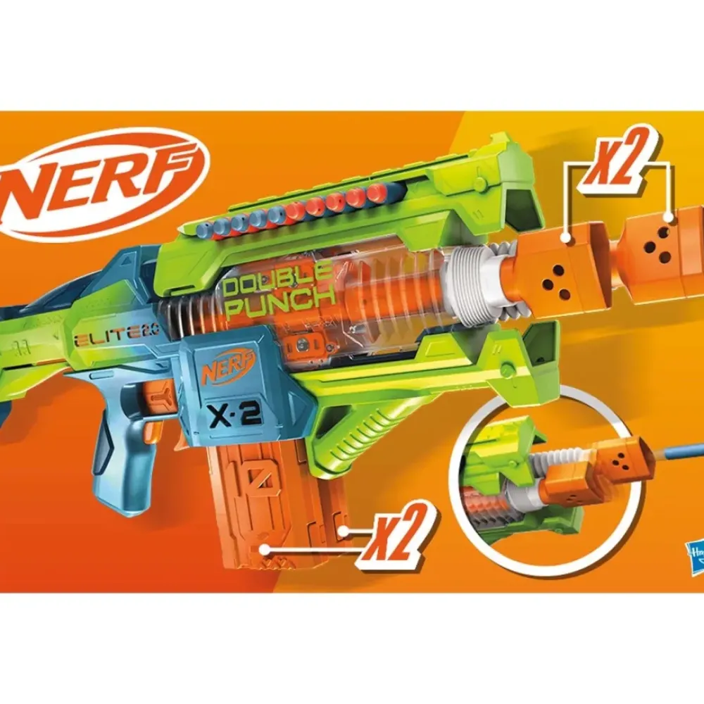 ¡Dos Canones! El Lanzador Nerf Elite 2.0 Double Punch Cuenta Con 2 Canones Que Se Mueven Hacia Adelante Y Hacia Atras Rapidamente Mientras Lanzas.
