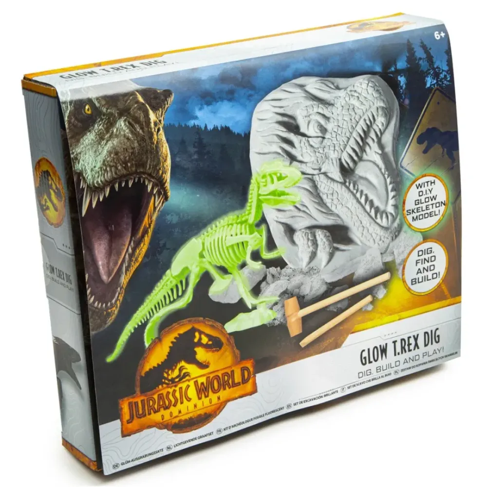 ¡Excava, Encuentra, Construye Y Juega! Con Este Set De Excavacion Del T-Rex Luminoso De Jurassic World. El Juego Incluye: Bloque De Excavacion, Esqueleto De T-Rex Para Construir Y Fabricar, Que Brilla En La Oscuridad , Hoja Informativa Sobre Los Dinosaurios, Cincel Y Martillo.