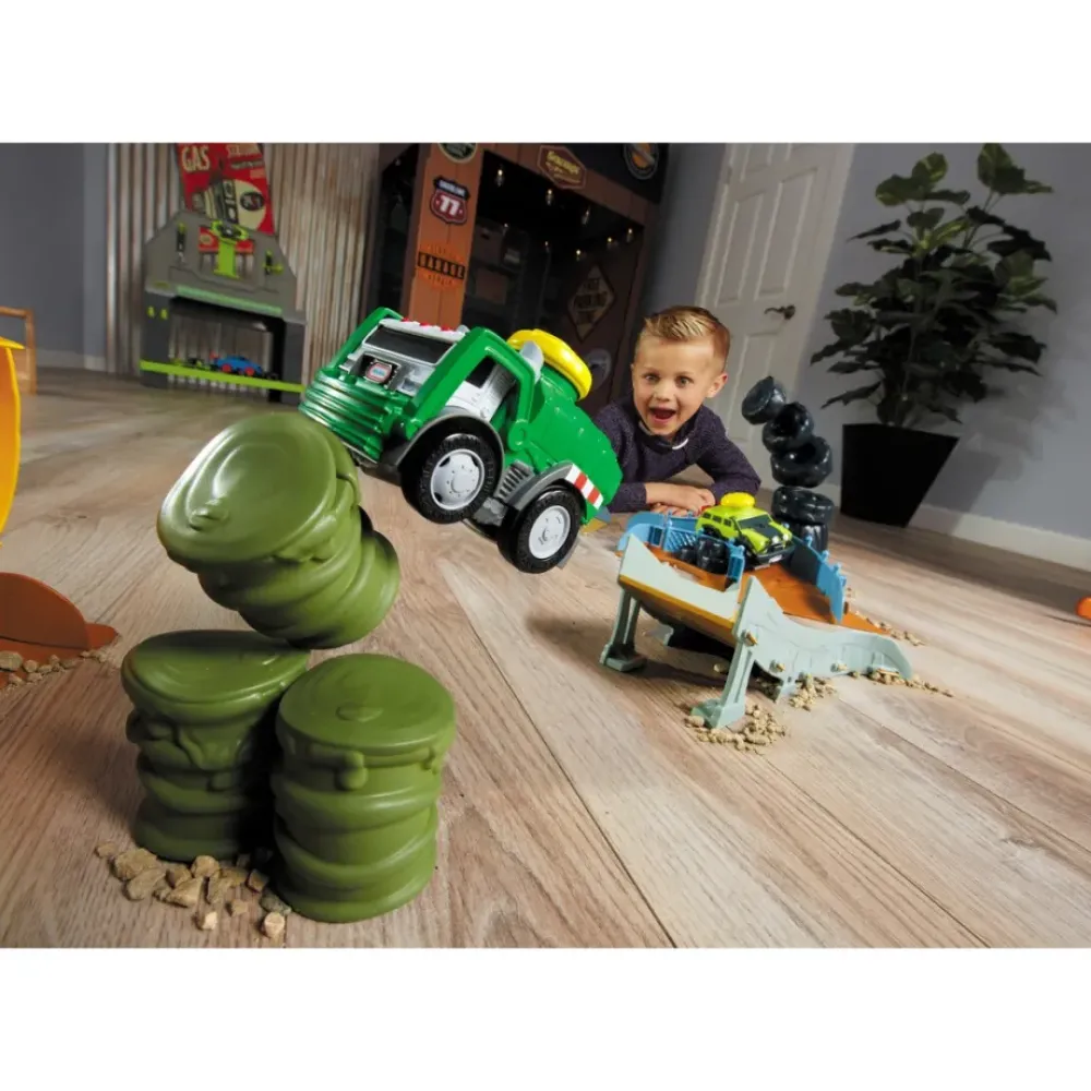 ¡Los Mas Pequenos Disfrutaran De La Carrera Con Estos Pequenos Vehiculos Rapidos! ¡Golpea La Parte Superior Del Camion De La Basura Y Mira Como Se Va! Vea Cuantos Barriles Puede Derribar Mientras Salta A La Vez.