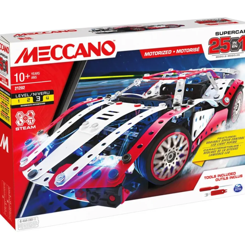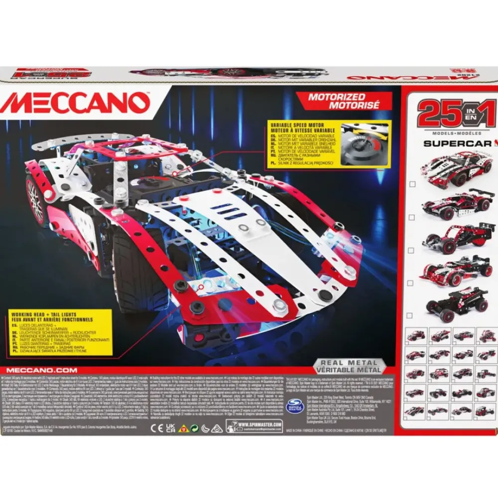 Acelera Tu Imaginacion Con El Set De Mecano Supercar 25 En 1. Con Este Set De Construccion Stem, Ideal Para Un Constructor Intermedio, Te Divertiras Montando Y Volviendo A Montar 25 Vehiculos De Lujo Motorizados (De Uno En Uno). Con Un Motor De 6 Voltios, Tubos Luminosos De Led, 347 Piezas, 2 Herramientas Y Una Guia De Instrucciones Faciles De Seguir Para Tres Vehiculos, Puedes Construir Un Rapido Y Elegante Meccano Supercar, Otras Variaciones O Usar Tu Imaginacion Para Crear Tu Propio Vehiculo. Para Cualquier Vehiculo Que Construyas, Los Tubos Luminosos De Led Te Proporcionan Luces Delanteras Y Traseras Que Se Iluminan, Y Puedes Ajustar La Velocidad Del Motor Para Que Tu Supervehiculo Pueda Ir Al Maximo. Despues De Completar Un Modelo, Ensenalo, Compite, Juega Con El O Desmontalo Y Construye Algo Nuevo. A Medida Que Vayas Construyendo Tus Modelos De Vehiculo, Adquiriras Conocimientos Basicos De Ciencia, Tecnologia, Ingenieria Y Matematicas. ¡Mejora Tu Coordinacion Oculo-Manual, Tu Capacidad De Resolver Problemas Y Tus Habilidades Motoras! El Set De Mecano Supercar 25 En 1 Ofrece Una Experiencia De Construccion Que Supone Un Desafio, A La Vez Que Resulta Gratificante, Que Los Ninos Y Los Adultos Pueden Disfrutar Juntos. Los Sets De Construccion De Juguetes Y Juguetes Educativos De Meccano Son Los Regalos Perfectos Para Los Ninos. Para Descubrir Mas Formas De Crear Con Tu Set De Supercar 25 En 1, Puedes Encontrar Instrucciones De Construccion Adicionales En Meccano.Com. El Juego Requiere 4 Pilas Aaa (No Incluidas). ¡Construye Un Supervehiculo De 25 Formas Distintas Con El Set De Mecano Supercar 25 En 1!