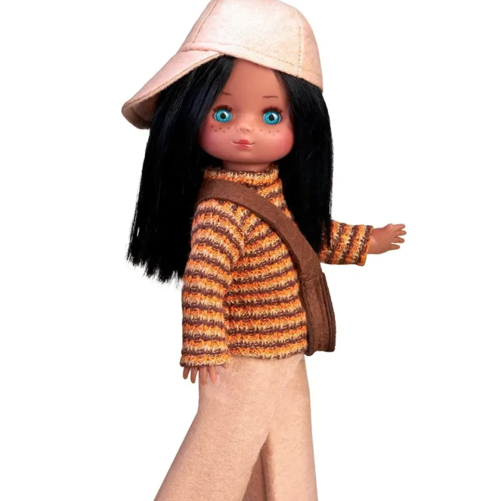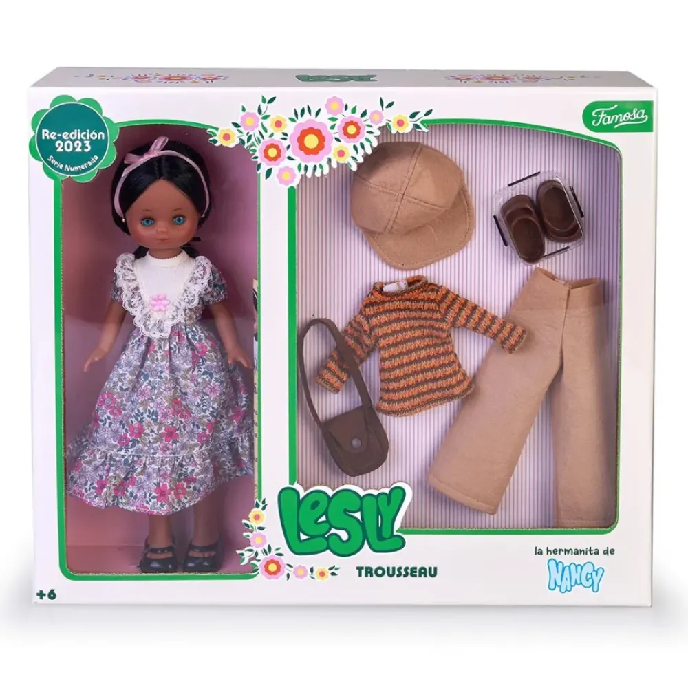 Lesly Negrita Con Pelo Negro Suelto Y Diadema Rosa Con Lazo. Viste Un Vestido De Flores Sin Mangas Y Manoletinas Negras. Ademas, Incluye Un Conjunto Sport Formado Por Pantalon Beige, Jersey De Rayas Marron Y Beige, Manoletinas, Gorra Y Bolso Bandolera Marron. Dos Conjuntos Ideales Para Acompanar A Su Hermanita Nancy De Paseo Por El Campo O Por La Ciudad.