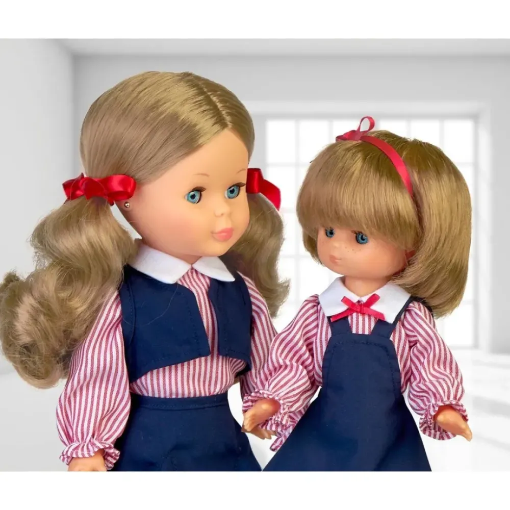 Reedicion Nancy Y Lesly Colegialasde Los Anos 70. Esta Vez Nancy Viene Acompanada De Su Hermanita Lesly, Ambas Vestidas Con Uniforme De Colegialas Tipico De La Epoca. Muy Conjuntadass Con Pichi-Lesly Y Dos Piezas-Nancy- De Color Azul Y Camisa De Cuadros Rojos A Conjunto Con Los Calcetines Altos. Completan Su Look Con Dos Coletasen El Caso De Nancy Y La Pequena Leslyuna Diadema Roja.Pelo Rubiocon Ojos Azules.