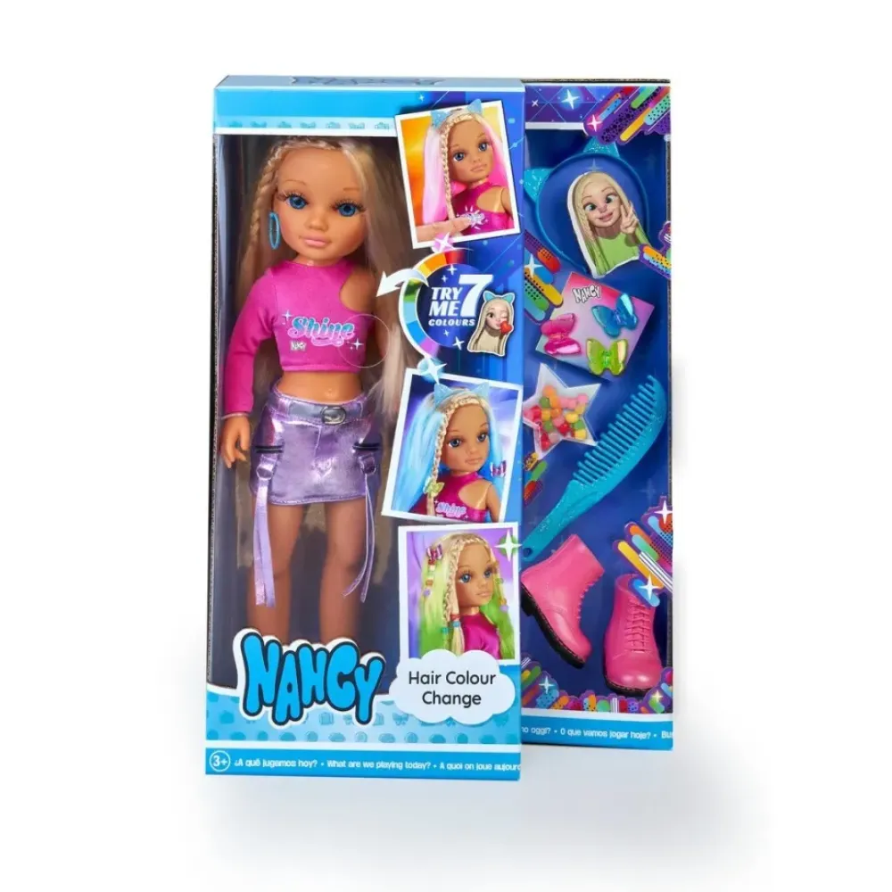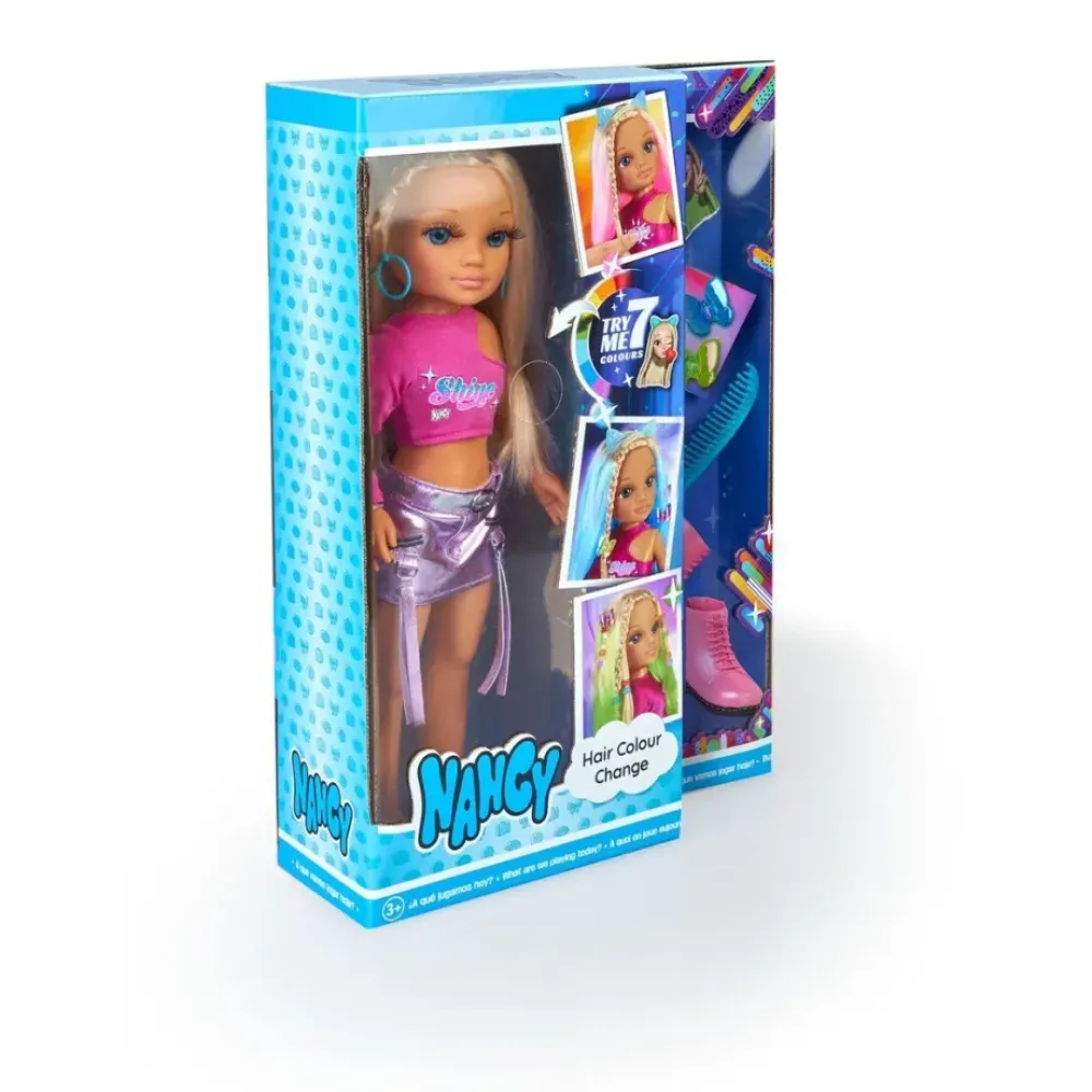 Con Nancy Hair Colour Change Podras Cambiar El Color Del Pelo De Nancy Con Solo Presionar Un Boton, En Hasta Siete Tonalidades Diferentes ¡El Efecto Es Magico! Para Hacer La Experiencia Colour Change Todavia Mas Alucinante Incluye Un Monton De Accesorios Para El Pelo,Para Hacer Diferentes Looks A Nancy Que Combinen Con El Color De Su Pelo: Pinzas En Forma De Mariposa, Bolitas De Colores Para Decorar Mechones De Pelo, Una Diadema Con Orejitas Y Un Peine Para Peinar Su Larga Y Rubia Melena. Nancy Esta A La Ultima Con Su Minifalda Efecto Cuero En Color Morado, Camiseta Fucsia Asimetrica Y Botas Militares.