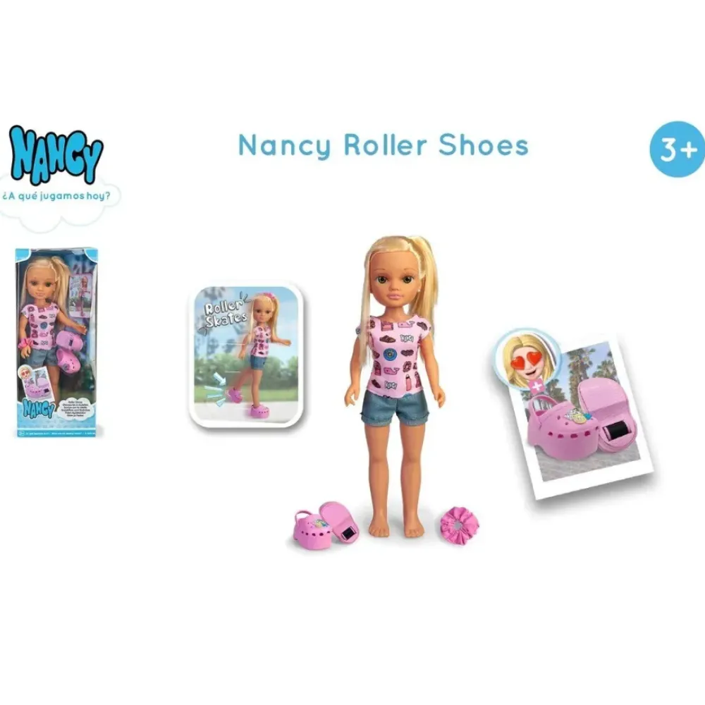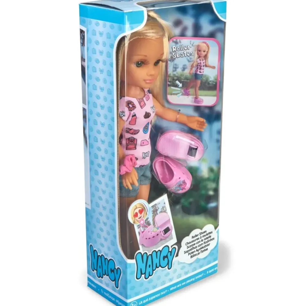 Nancy Con Zapatos De Plataforma Con Patines Esta Lista Para Ser La Muneca Mas Moderna. Sus Zapatos Tienen Unas Ruedas Para Patinar En La Suela Y Viene Con Diferentes Clips Para Decorarlos Como Tu Quieras. Lleva Una Camiseta Y Unos Shorts Vaqueros, Y Su Preciosa Melena Rubia Esta Sujeta En Una Coleta Con Una Goma Rosa.