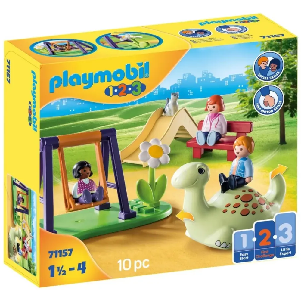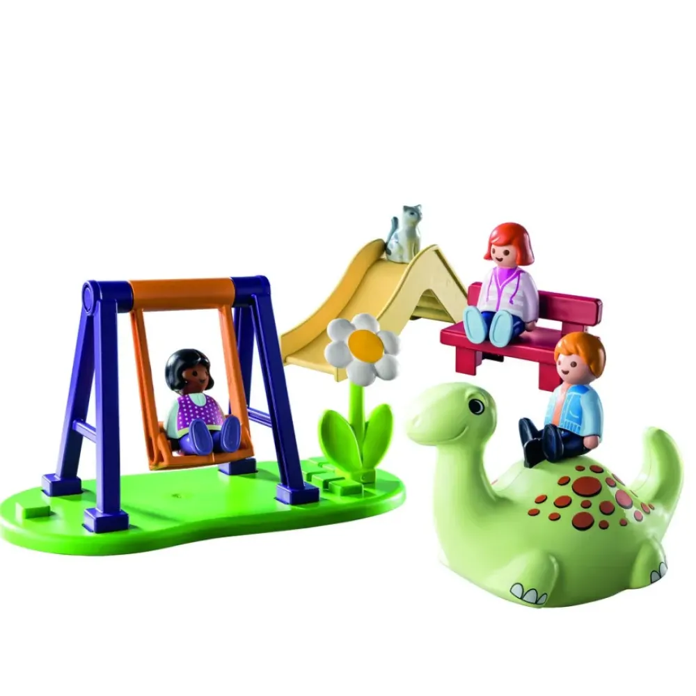 ¡Bienvenido Al Alegre Parque Infantil De Playmobil 1.2.3! Aqui, Los Pequenos Aventureros Pueden Disfrutar Jugando. Ya Sea Dando Unas Divertidas Vueltas En El Columpio, Deslizandose Por El Tobogan O Tambaleandose En El Gran Dinosaurio, La Diversion No Tiene Limites. Mientras Tanto, La Madre Se Acomoda En El Banco Y Observa Todo. Con Los Juegos De Playmobil 1.2.3, Los Ninos Y Ninas De A Partir De Ano Y Medio Pueden Iniciarse En El Gran Y Colorido Mundo Playmobil Y Experimentar Sus Primeros Juegos De Rol Mediante La Motricidad Fina, La Creatividad, El Desarrollo Del Lenguaje, La Comprension Cognitiva Y Las Habilidades Sociales.