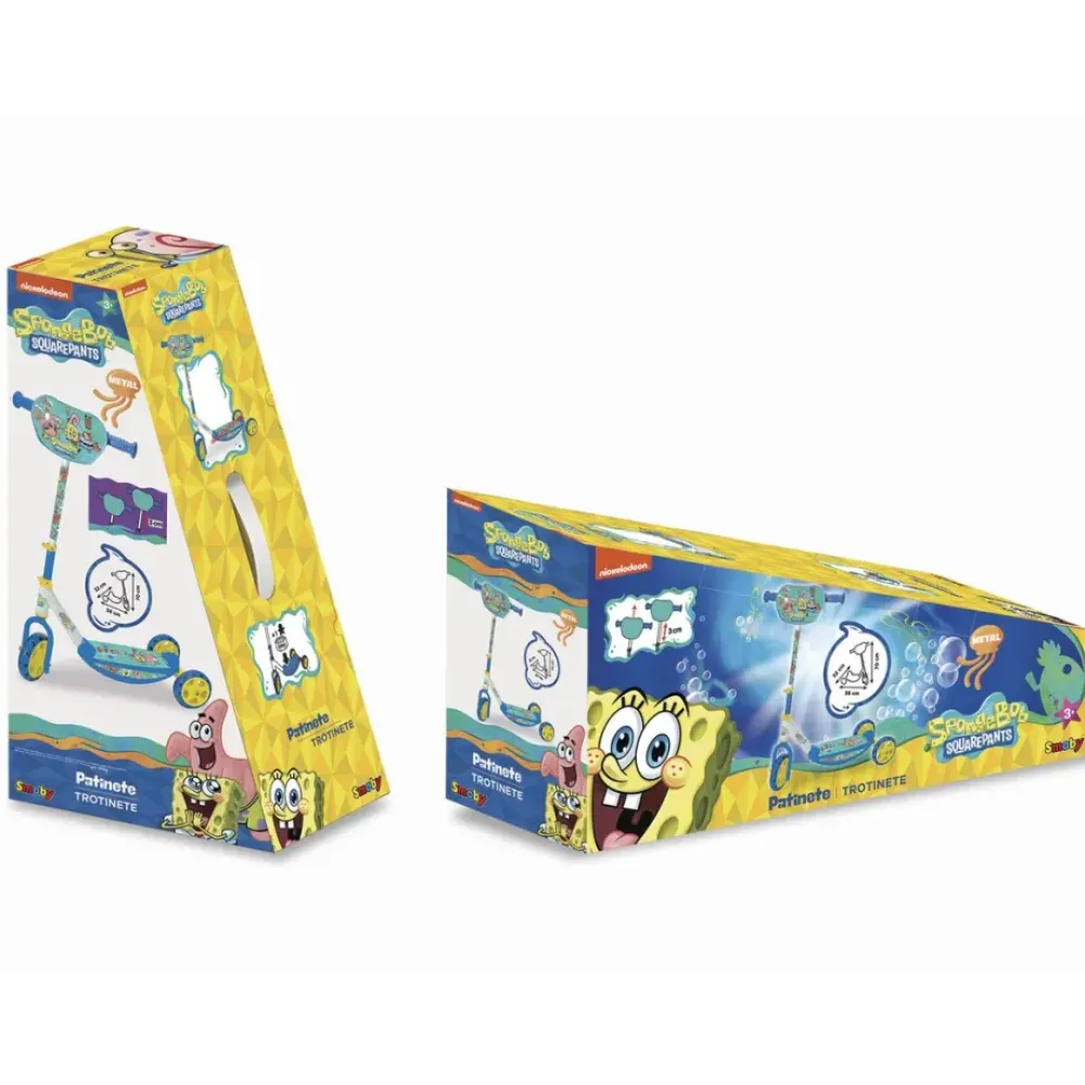 Patinete De 3 Ruedas Con Licencia De Bob Esponja. Manillar Regulable En Altura En 5 Cm. Dibujo De La Base En Iml Para Que No Se Pueda Borrar. Peso Maximo Soportado 20 Kg. Dimensiones: 55 X 32 X 65 Cm.