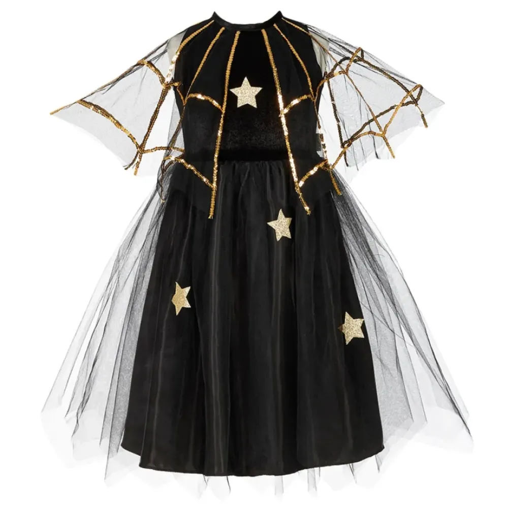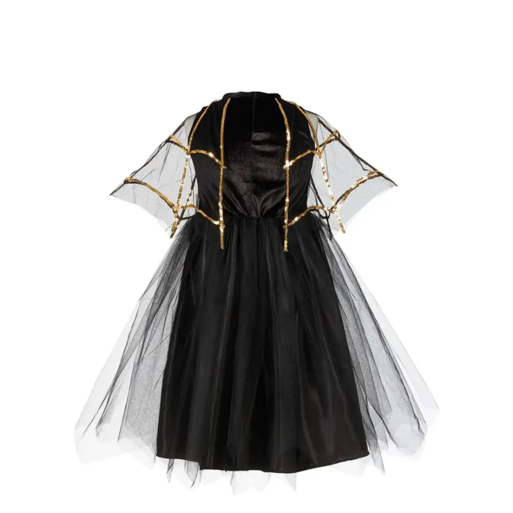 Vestido Negro Con Estrellas Doradas Y Capa Y Falda De Con Tul.