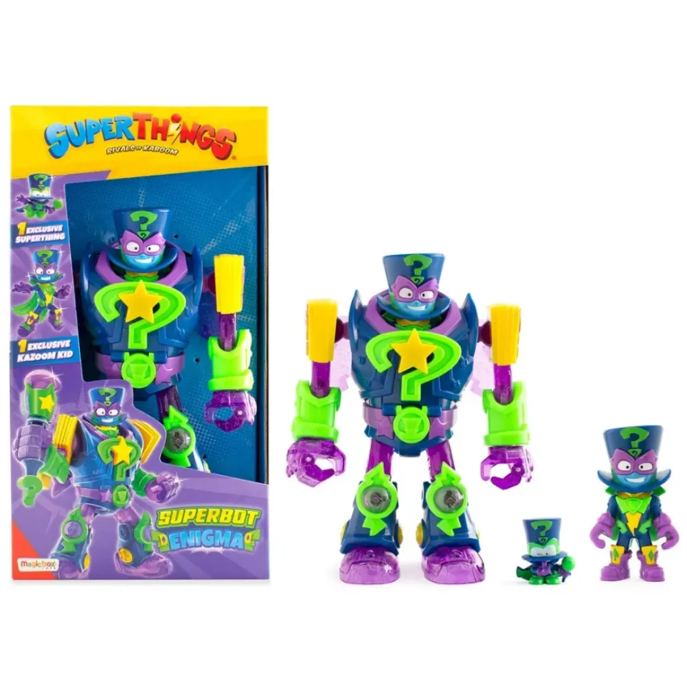 ¡Temblad, Villanos!¡Llega El Superbot De Enigma! Protege Kaboom City Con Este Nuevo Aliado Cargado De Energia Kazoom. Sobrevuela La Ciudad Abriendo Sus Alas Y Si Toca Entrar En Combate, ¡Dispara Su Accesorio Y Derrota A Los Malos! ¡La Aventura Esta Garantizada! Contiene 1 Robot Articulado Con Su Accesorio De Combate, El Kid Enigma Exclusivo Y El Superthing Enigma Exclusivo.
